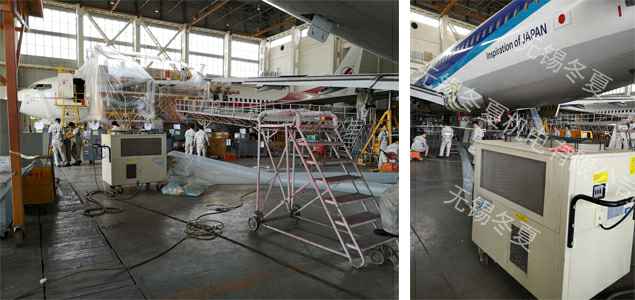 客户诉求:机场机库机型保养维修时需断电后在机舱内进行作业,机舱内无法通风,空调无法工作,严重影响工人工作效率,并引发了多起中暑事故
